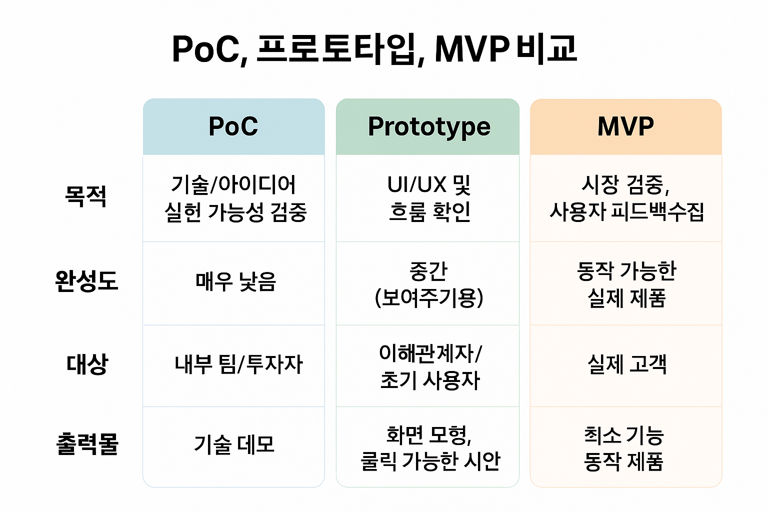 | 목적 | 기술/아이디어 실현 가능성 검증 | UI/UX 및 흐름 확인 | 시장 검증, 사용자 피드백 수집 |